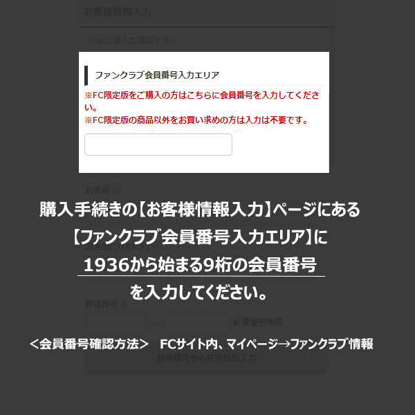 ※ご購入手続きの際、[お客様情報入力]ページ上部【ファンクラブ会員ID入力エリア】に、1936から始まる9桁の会員番号を入力してください。