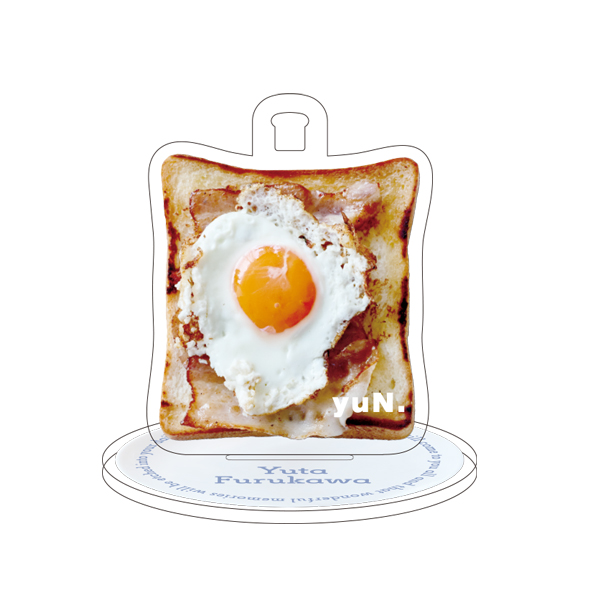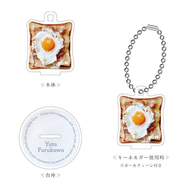 古川自身による「どうしても立てられるようにしたい」との希望により実現した、古川作のベーコンエッグトーストを飾れるアクリルスタンド。キーホルダーとしても使用できるようにして用途の幅を広げました。